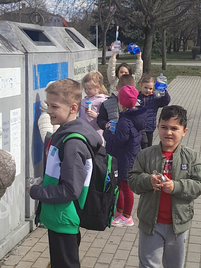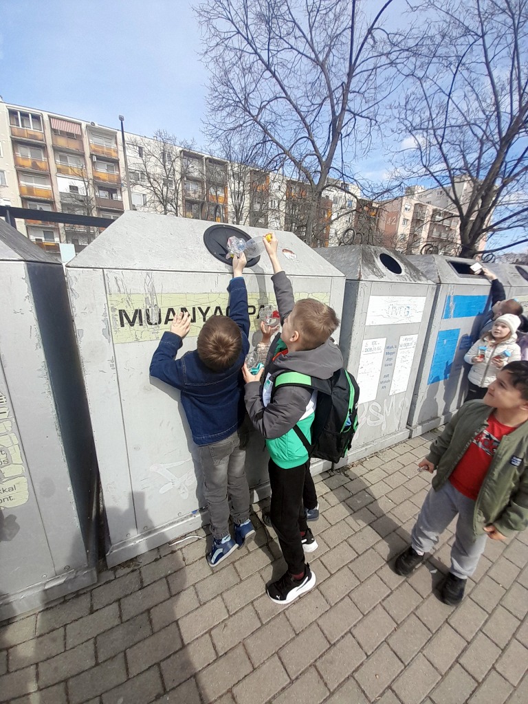 Az Ecomissio Kft. munkatársa a szelektív hulladékgyűjtés fontosságát ismertette. A gyerekek kipróbálták a flakonok tömörítését.
