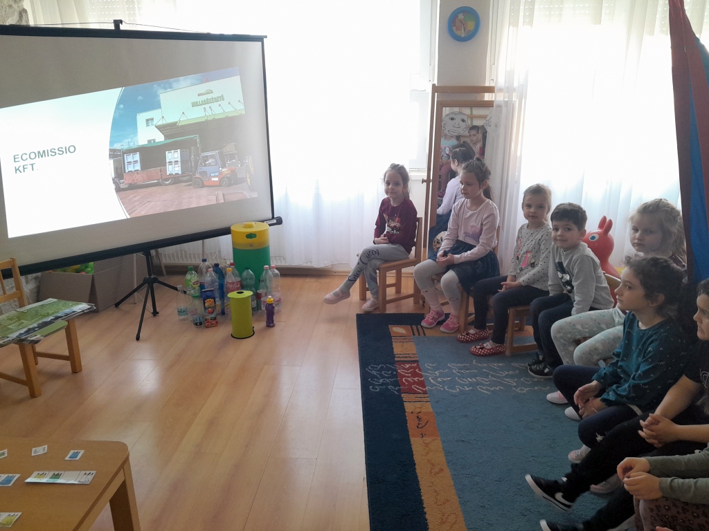 Az Ecomissio Kft. munkatársa a szelektív hulladékgyűjtés fontosságát ismertette. A gyerekek kipróbálták a flakonok tömörítését.